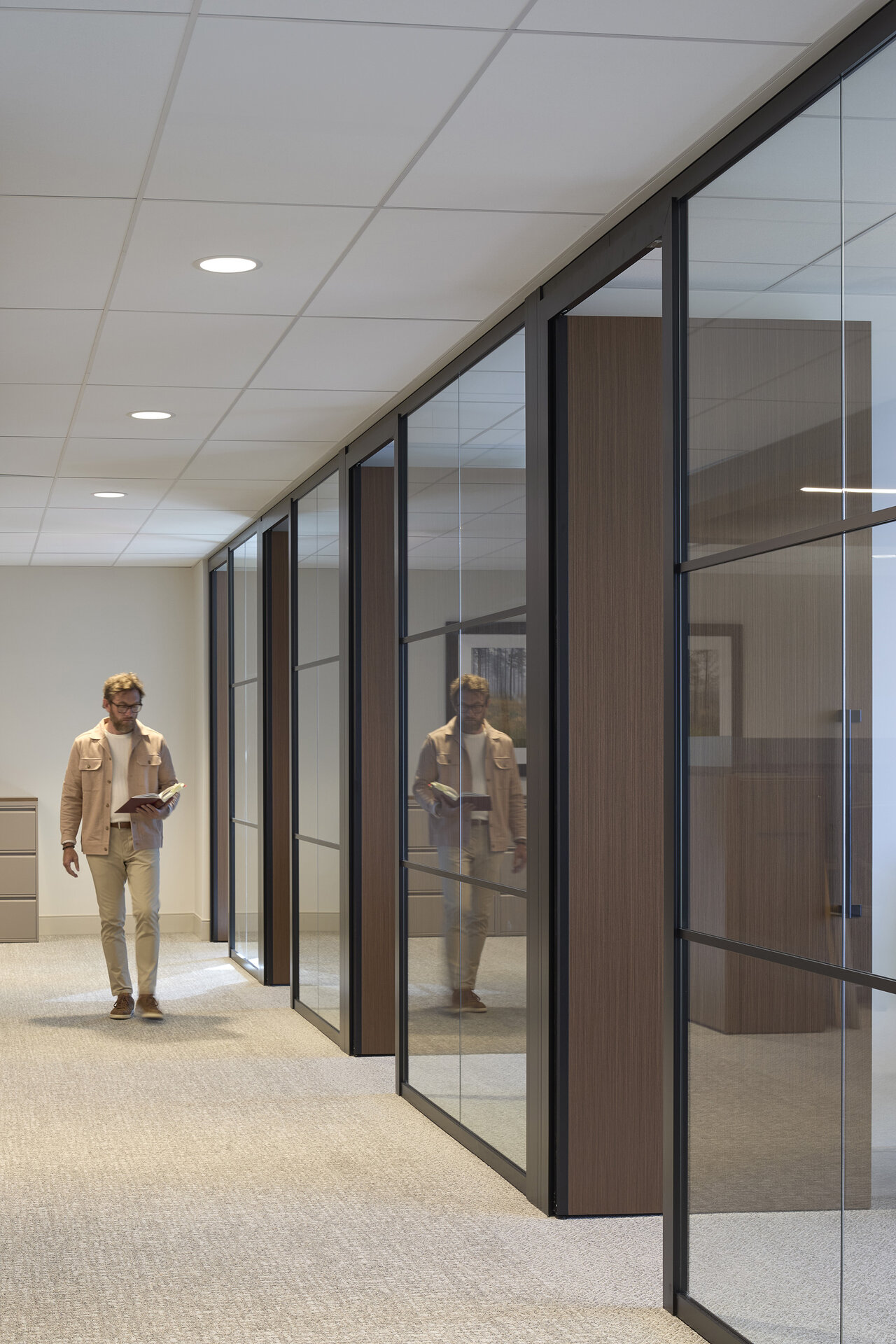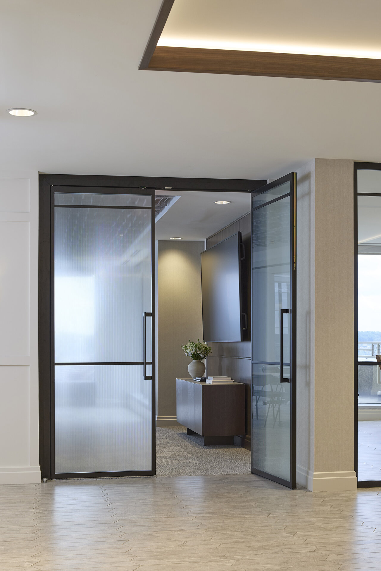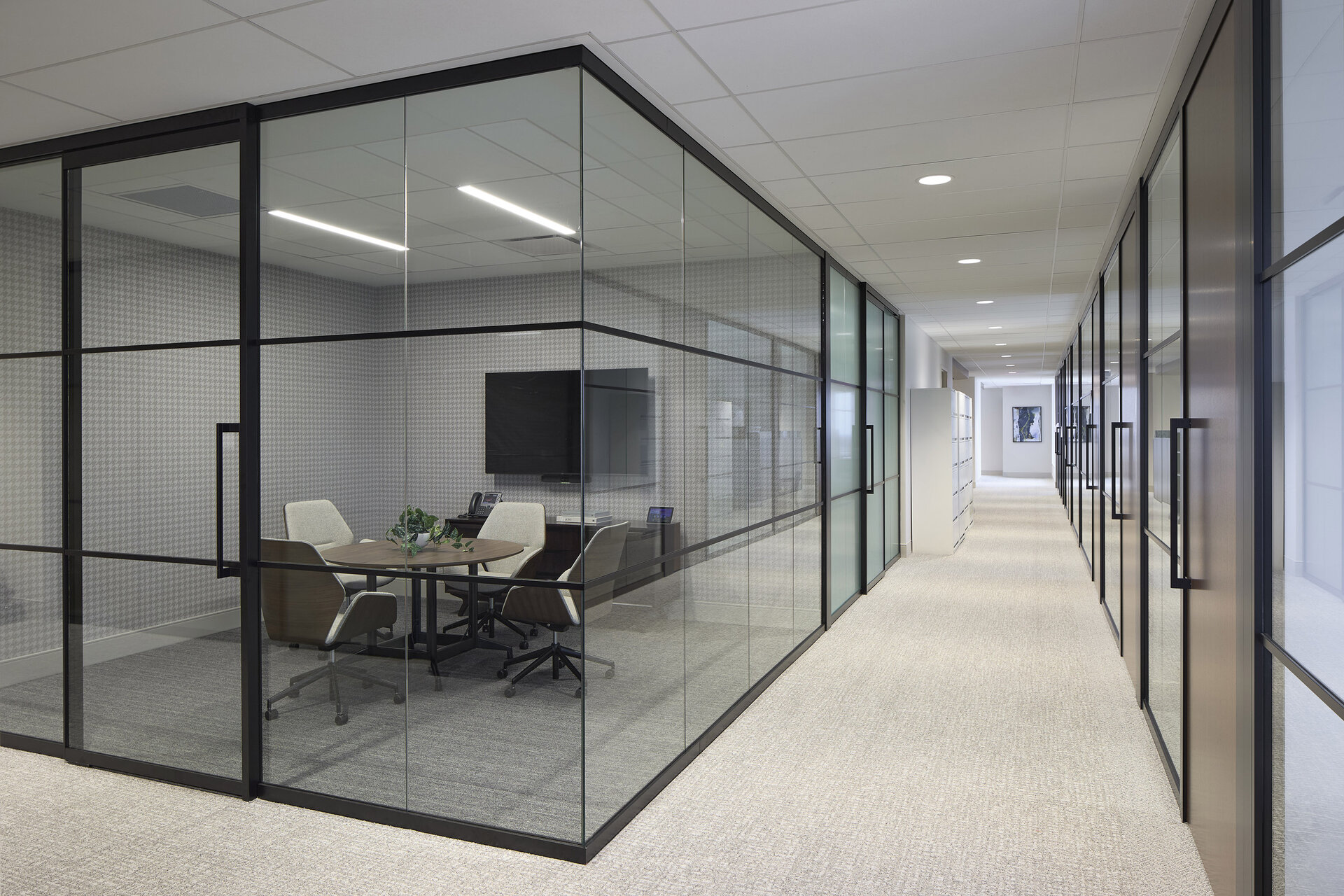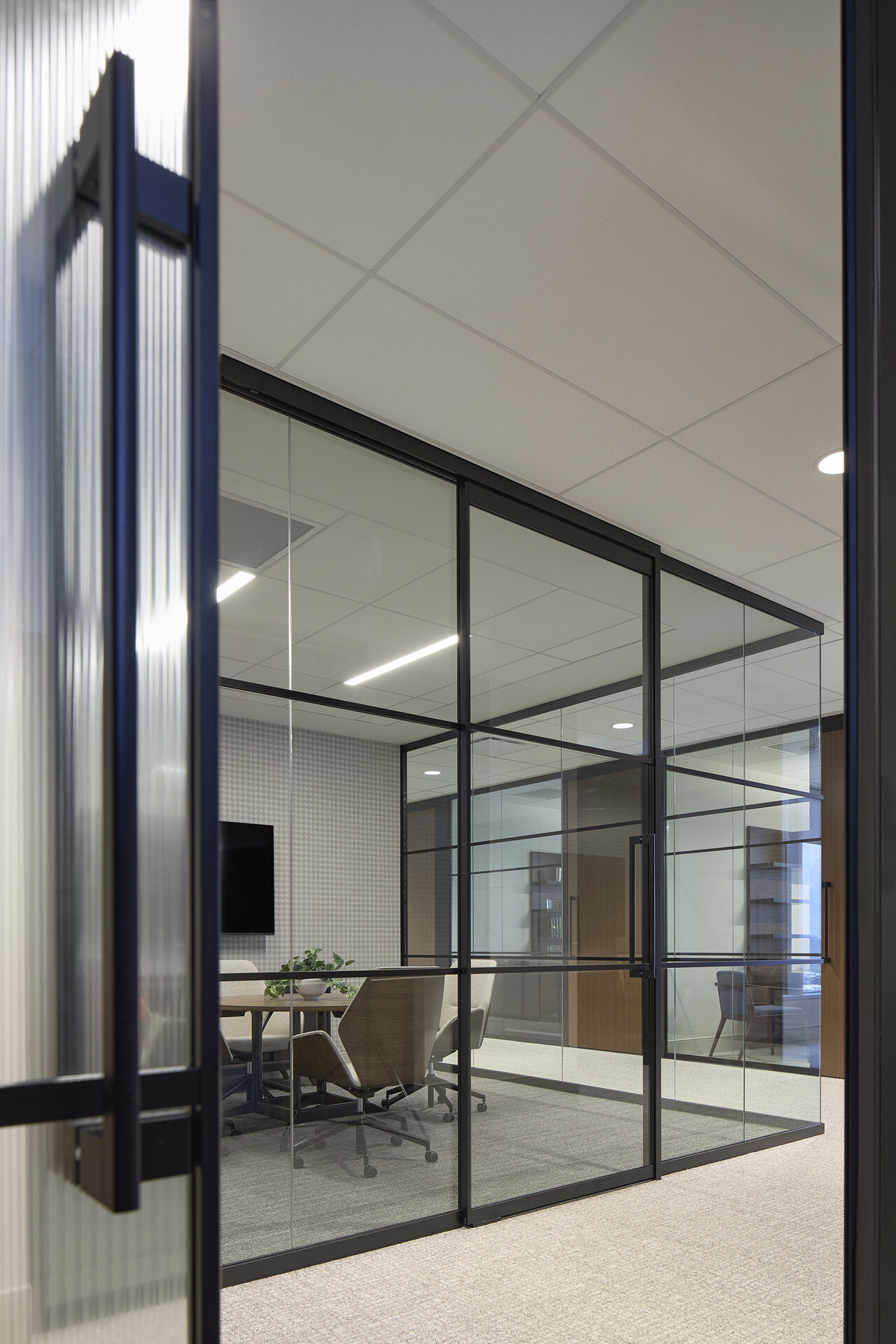 Teknion architectural walls were used to maximize daylighting and exposure to the sweeping views beyond. Since confidentiality is of the utmost importance in their work, fluted window film on the glass and adjacent drapery were used to provide visual privacy.