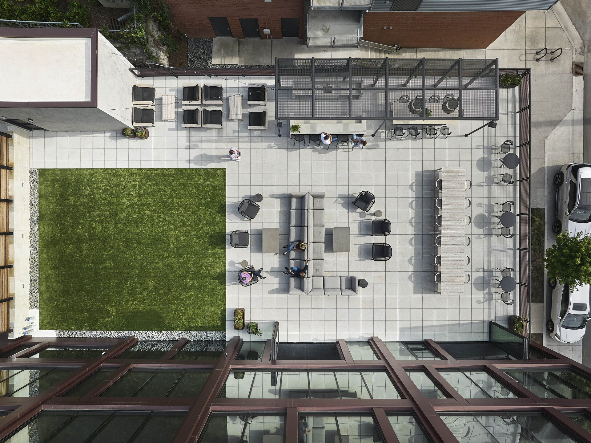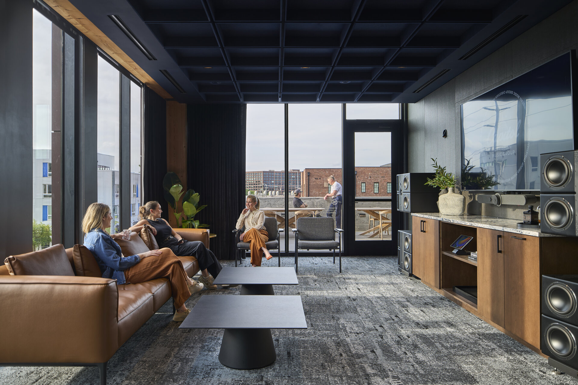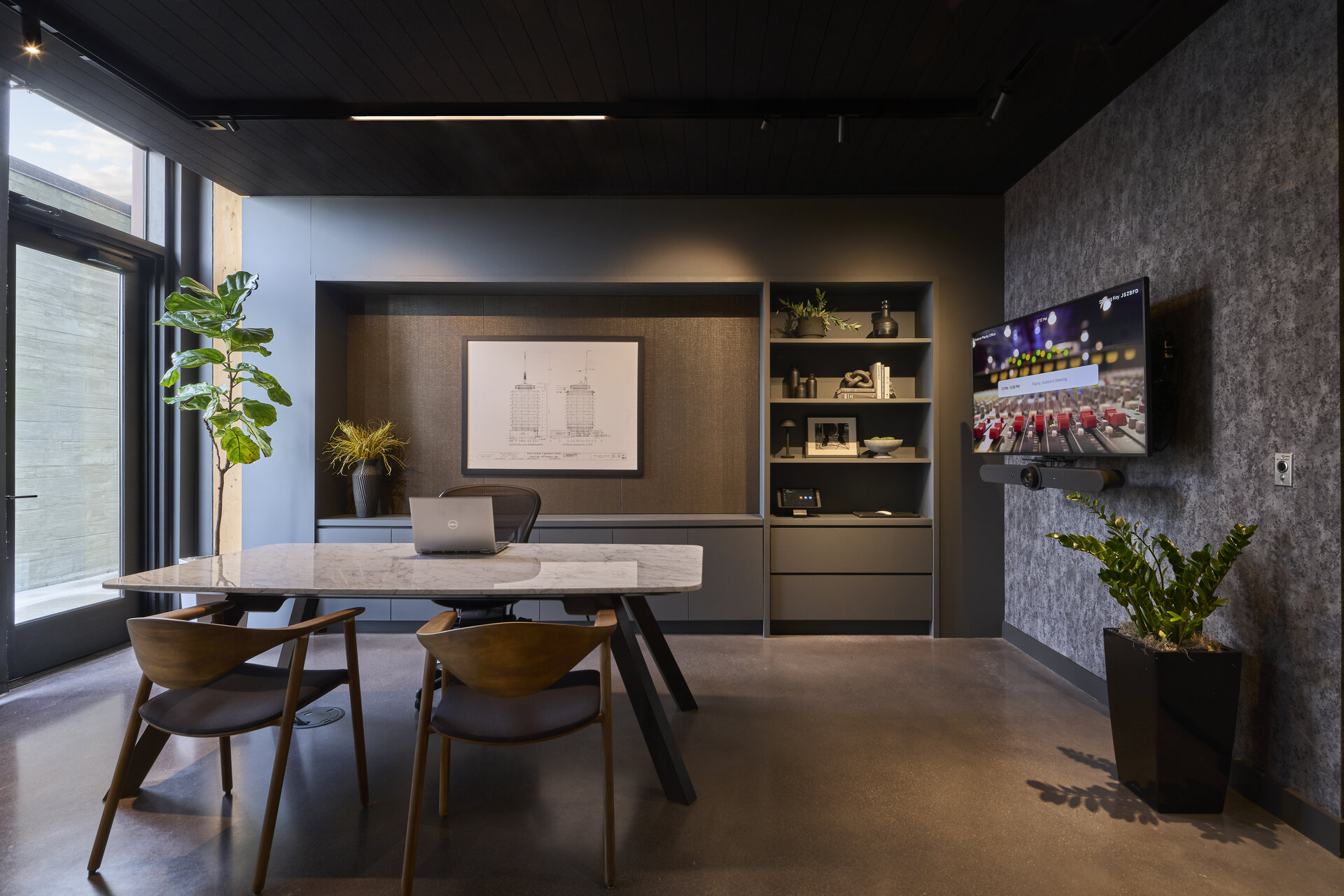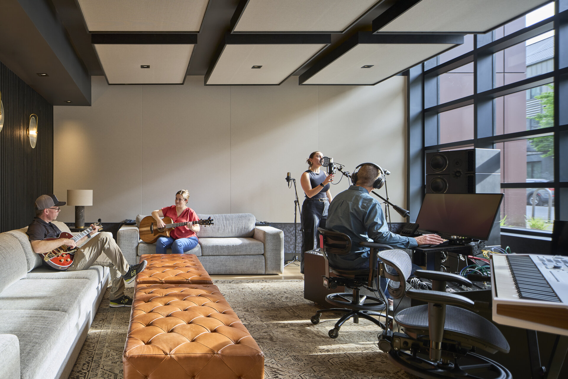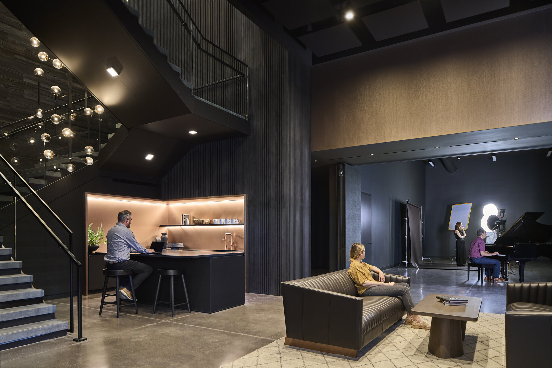 Hospitality, flexibility, and collaboration were three main themes of the space. The reception area with adjoining coffee bar, work lounge, and outdoor terrace provides a multi-purpose welcome center and entertainment space. From daily impromptu social gatherings to more formal music performances by CCMG talent, this dynamic, open concept sets the tone for Capitol’s casual, collaborative culture. In contrast, smaller spaces like listening rooms and the Executive Lounge support more intimate hosting environments for private gatherings.