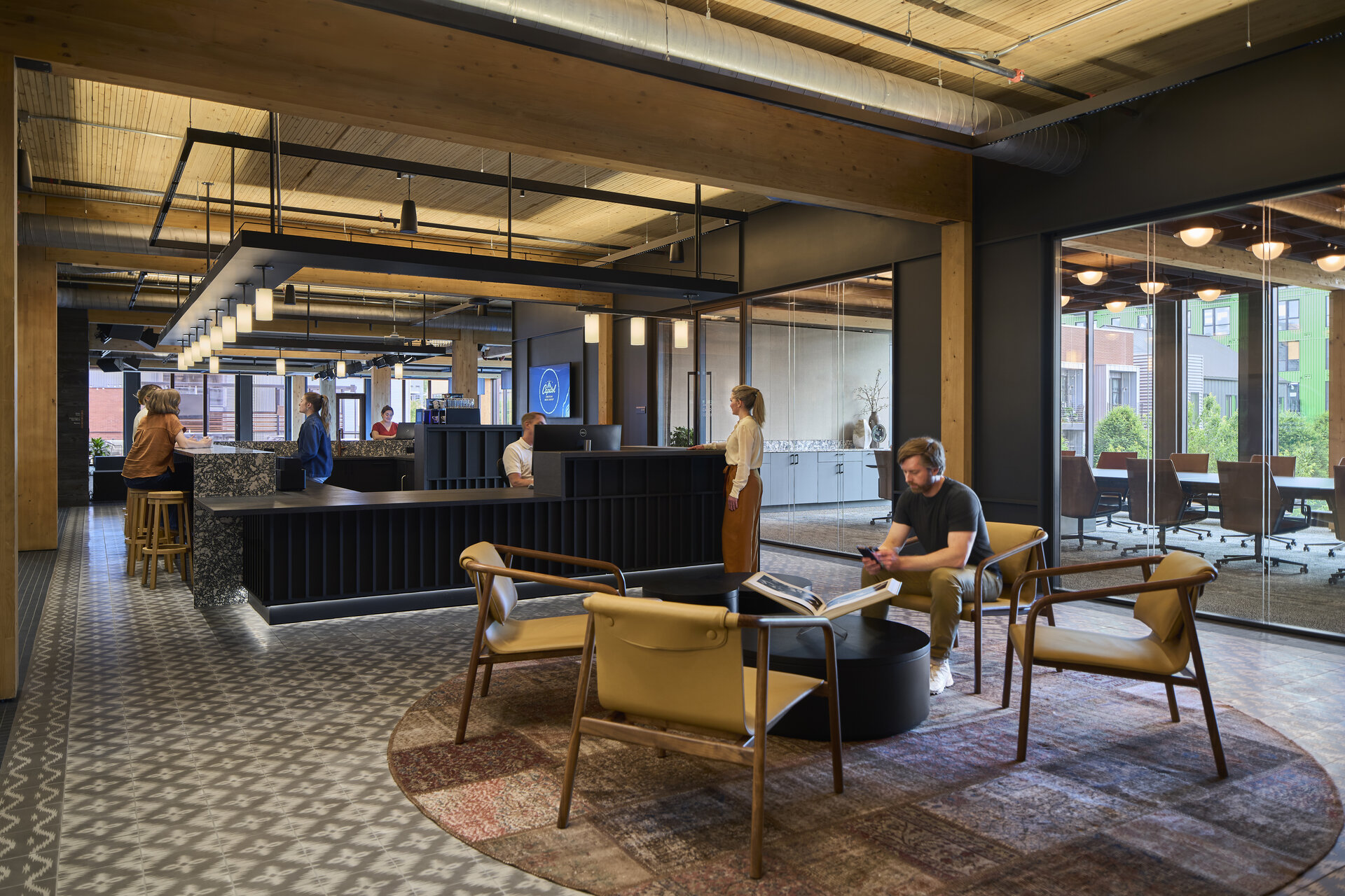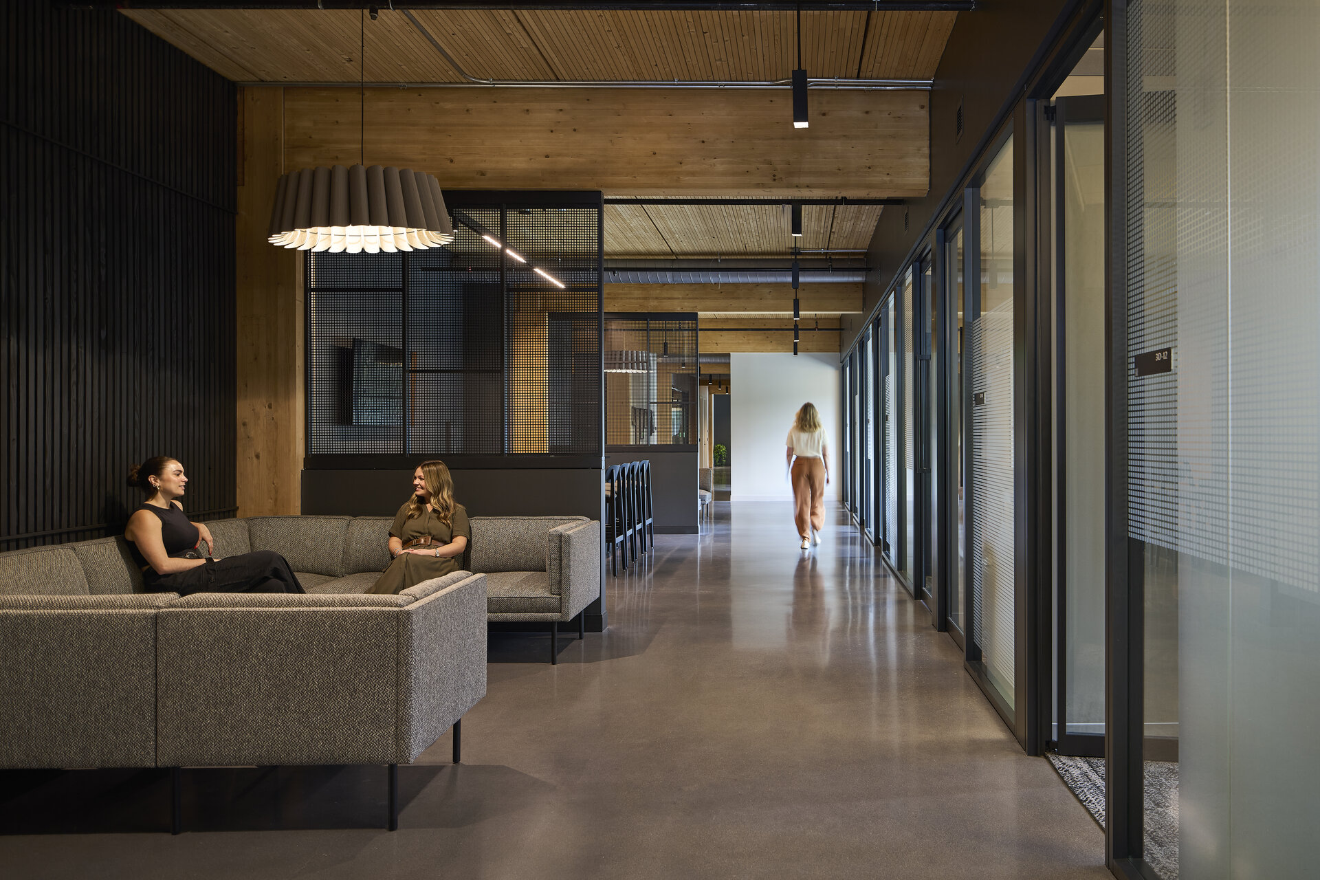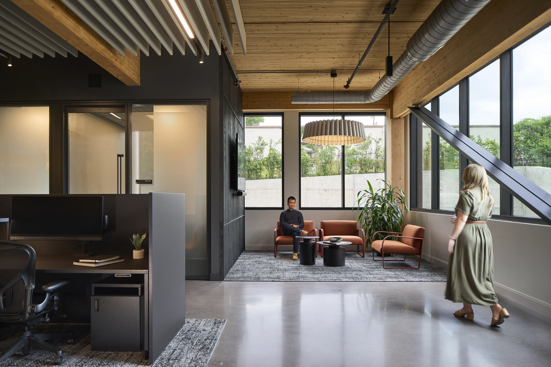 Providing employees with a flexible, hybrid work model that embraces free address and part-time remote work was also a significant design consideration. Workstations and private offices had to support this level of flexibility, mobility, and security. All desks were height-adjustable, storage components were outfitted with security keypads, and monitor arms were provided as well as secondary desk lighting to provide a range of ergonomic support.