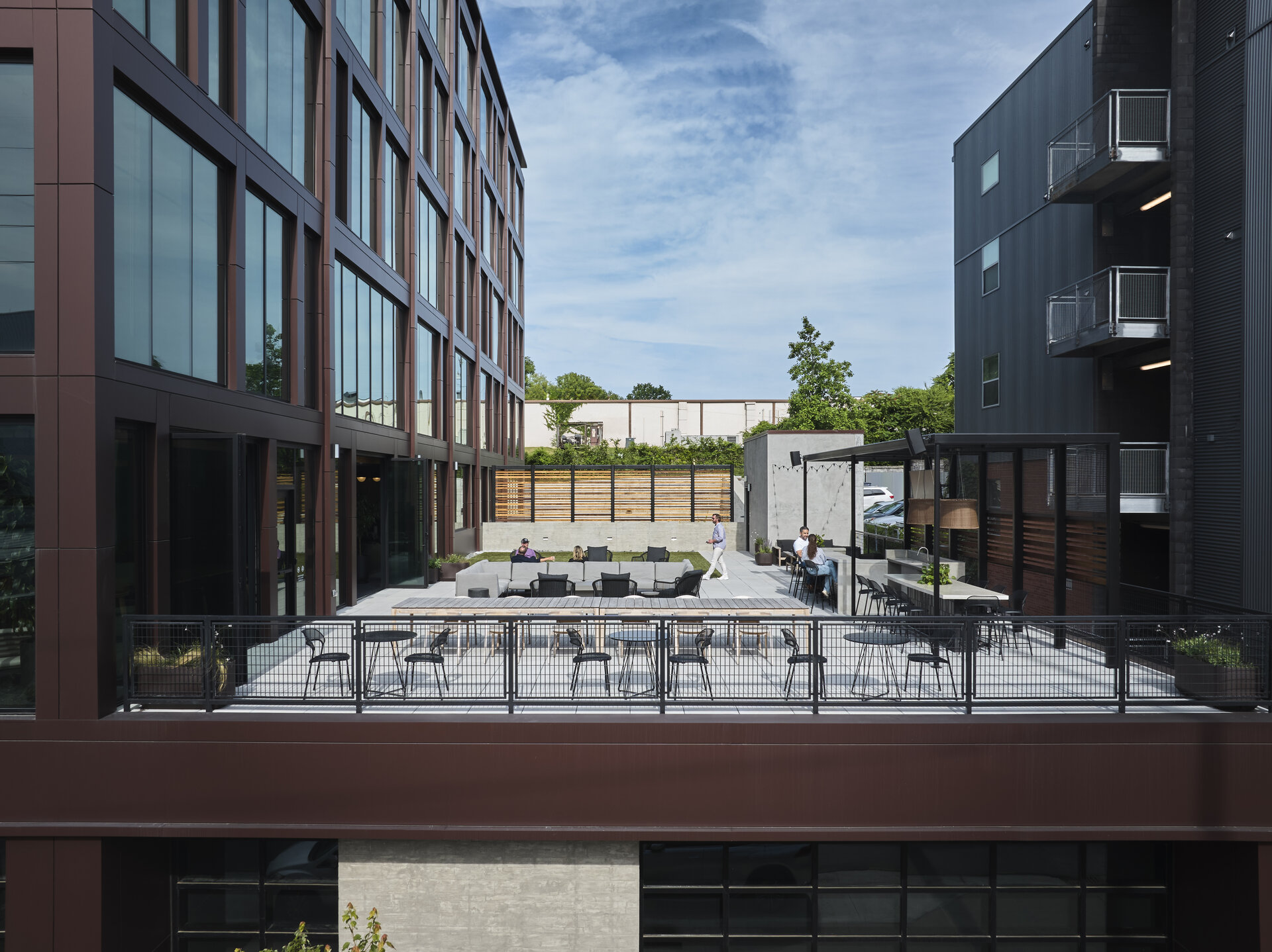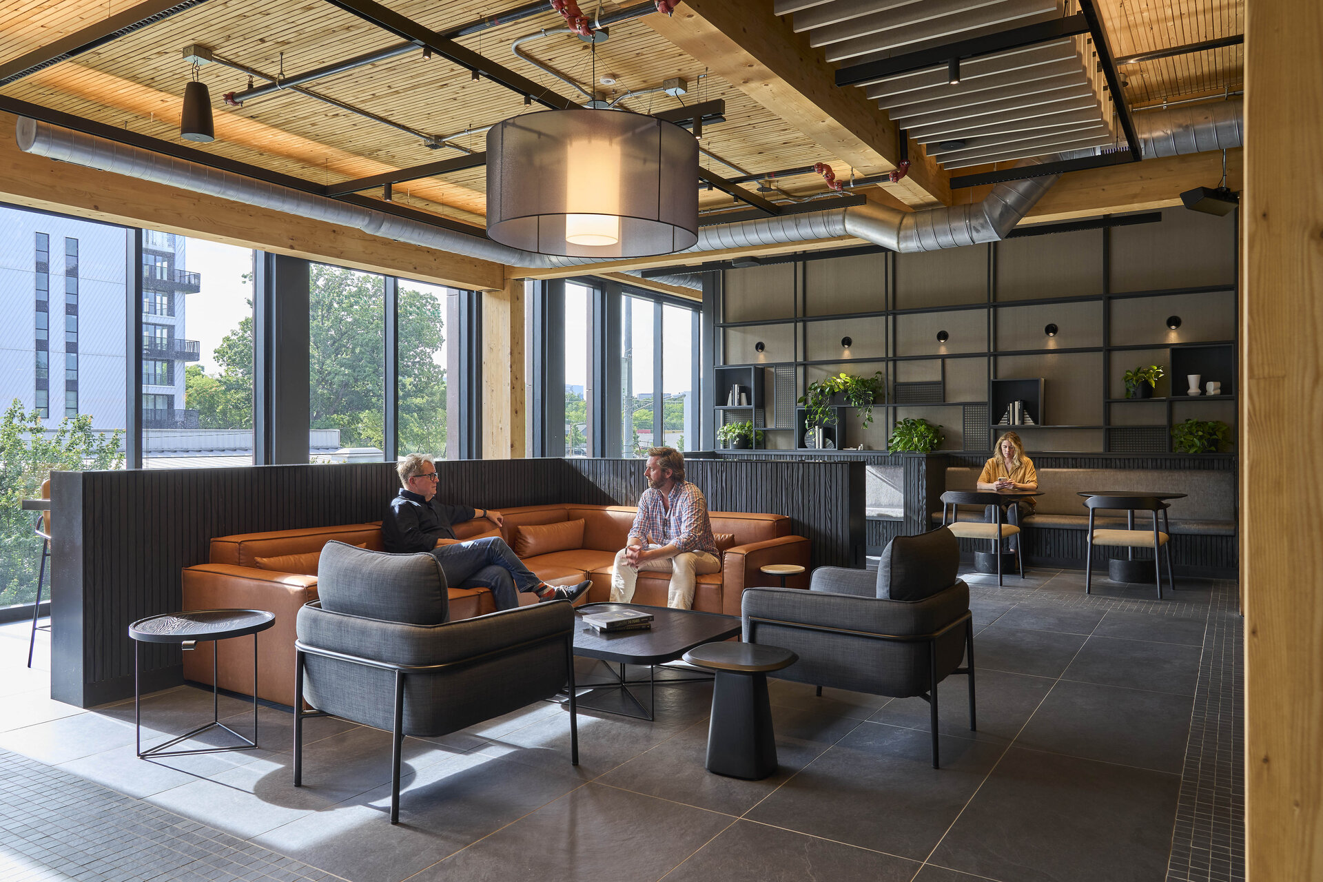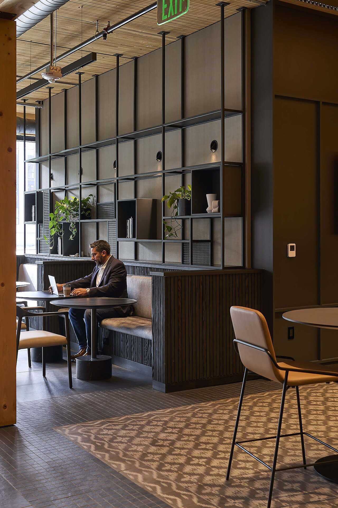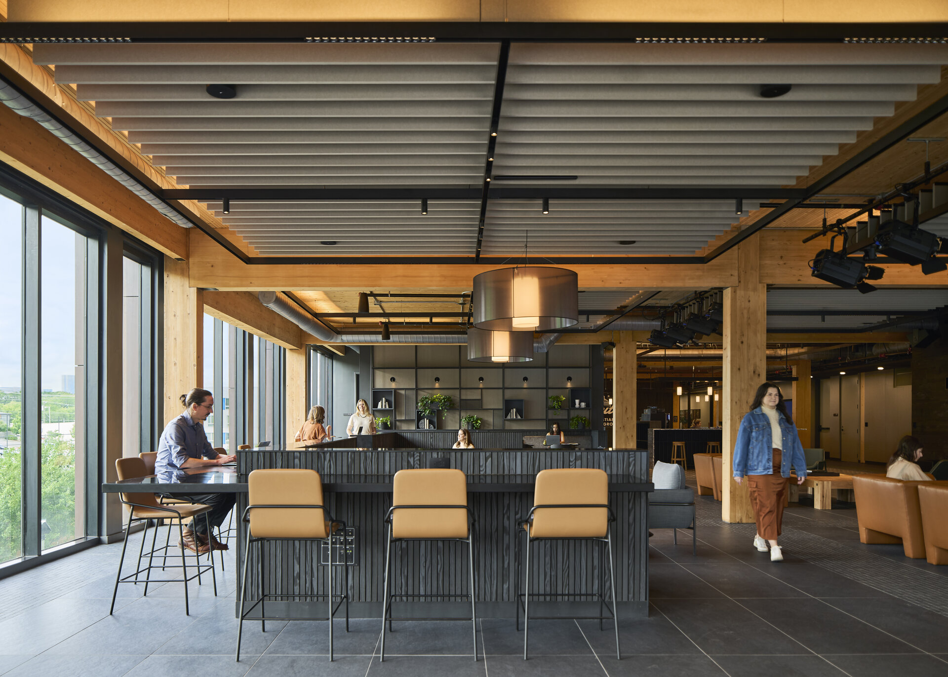 Providing employees with a flexible, hybrid work model that embraces free address and part-time remote work was also a significant design consideration. Workstations and private offices had to support this level of flexibility, mobility, and security. All desks were height-adjustable, storage components were outfitted with security keypads, and monitor arms were provided as well as secondary desk lighting to provide a range of ergonomic support.