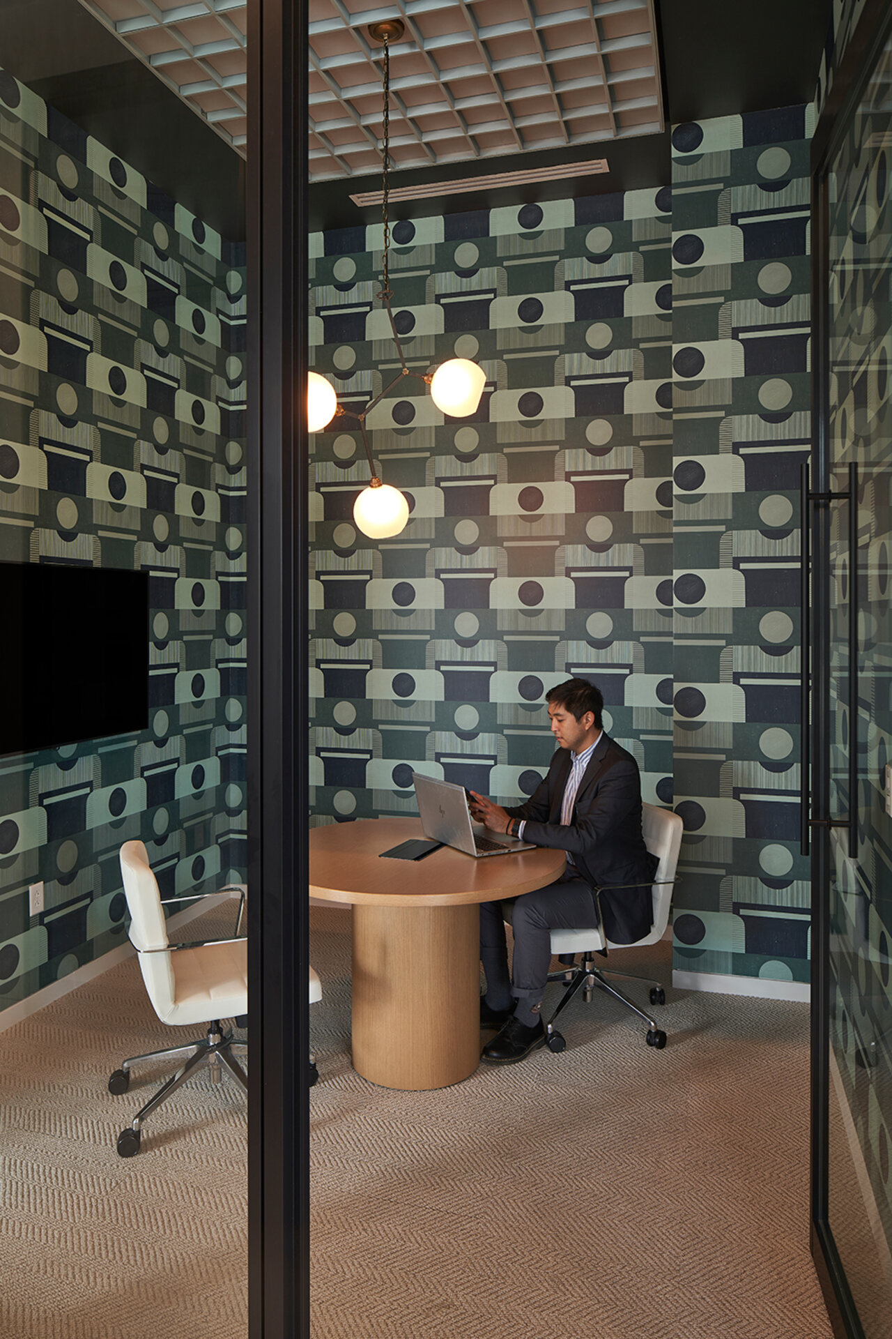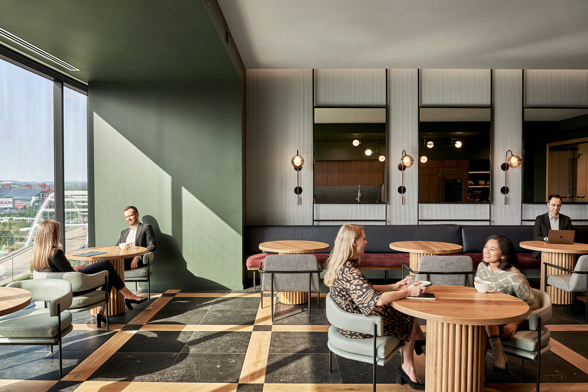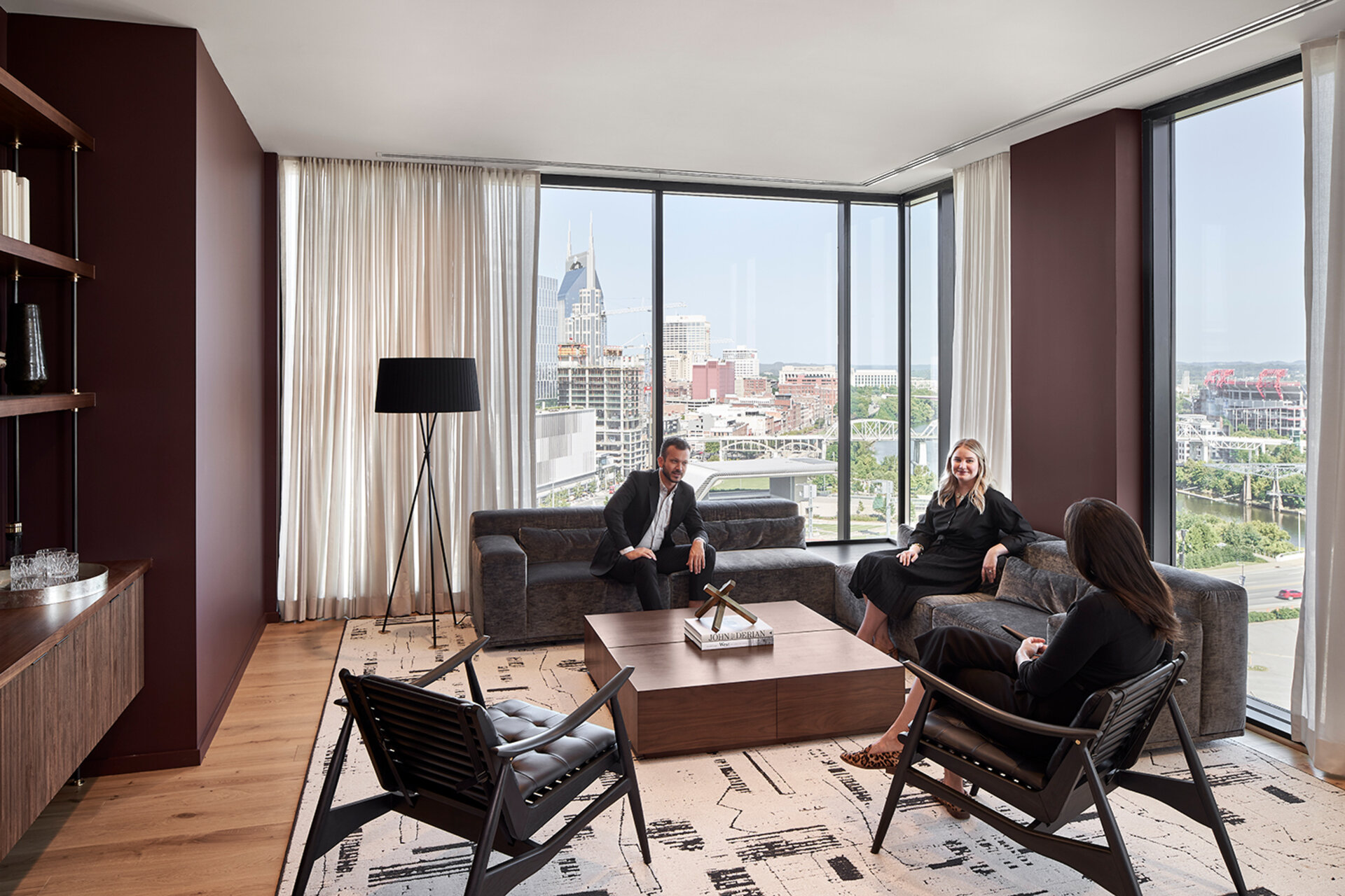 Positioned on the bluffs of the Cumberland River, Rolling Mill Hill was once the site of roller mills that processed wheat, corn, and lumber. In an effort to pay homage to this history, the Fourth Capital spaces subtly incorporate various design elements that allude to this bygone manufacturing era. One example is a ribbed motif which was inspired by the former flour mills. This detail appears in an array of applications, from the scalloped green marble on the reception desk, to custom dining tables in the café, to walnut millwork in the Living Room.