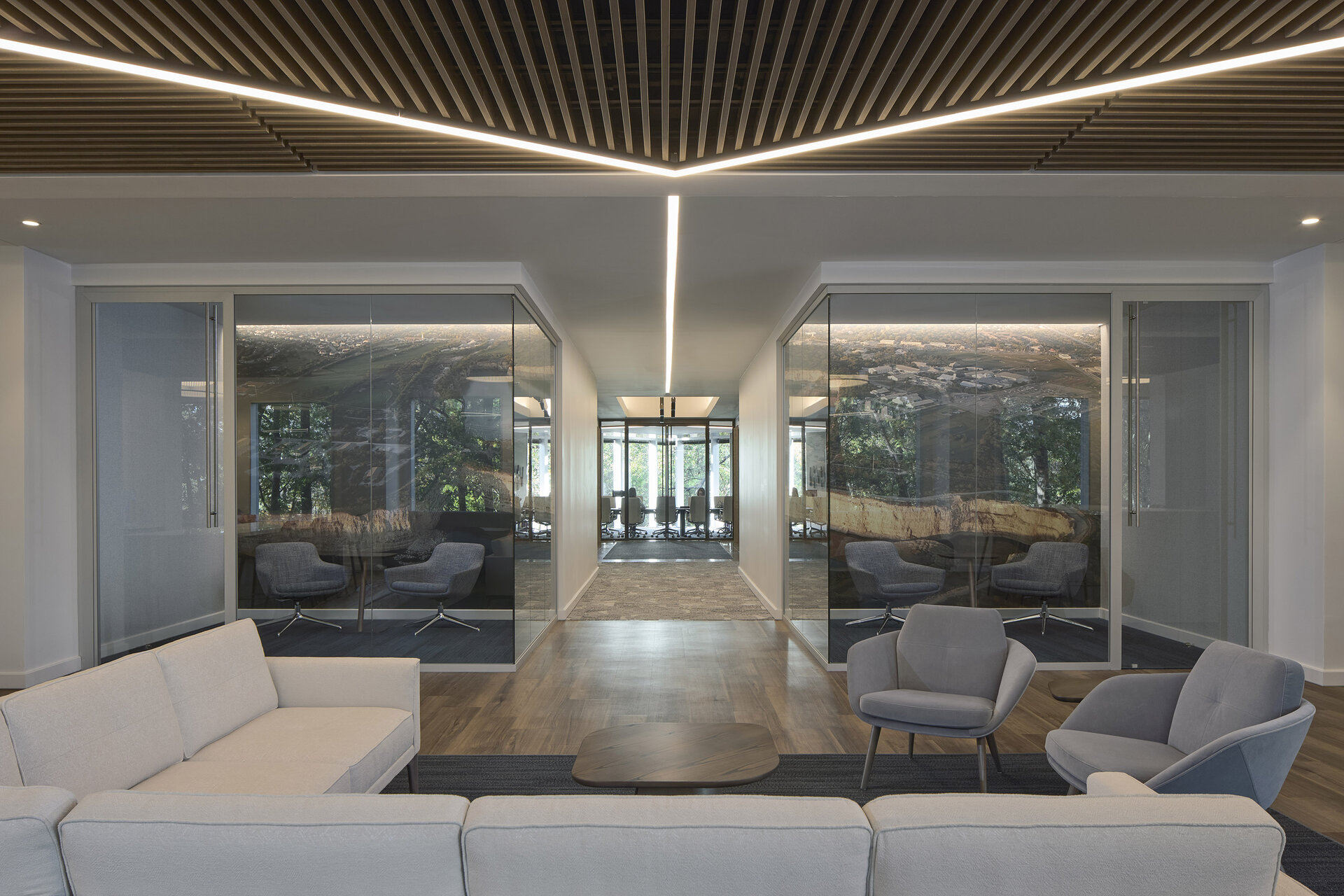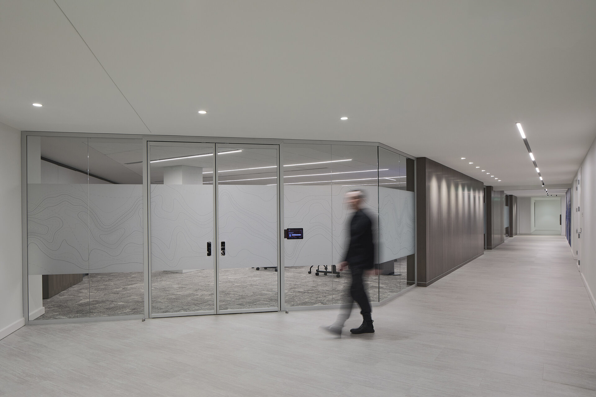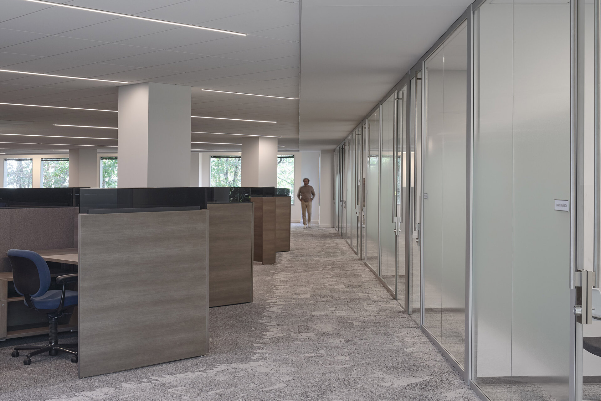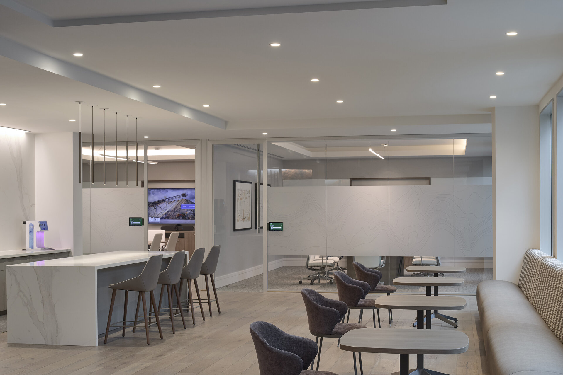 Over 3,000 linear feet of Teknion architectural walls were used to maximize daylighting and exterior views within the space. Interior meeting rooms and offices that used to be made of traditional drywall were replaced with glass walls to create a more open, connected, and contemporary workplace.