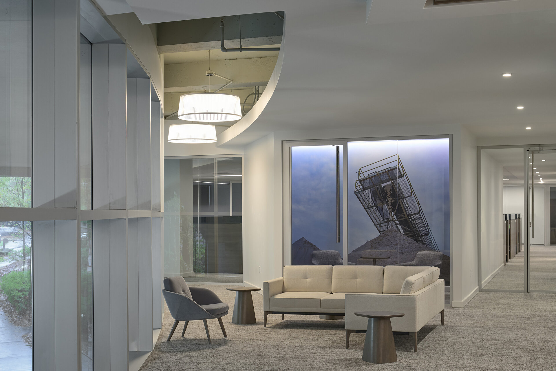 The extensive, 6-floor renovation project aimed to create a workplace where people simply want to be. This included maximizing the connection to the natural surroundings since most of their global workforce spends most of the day outside, on-site at one of their many rock quarries.